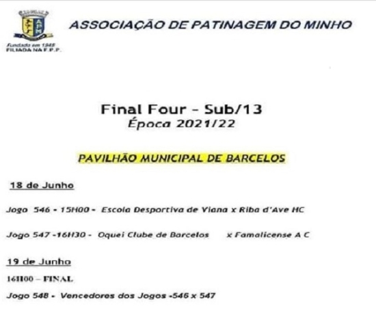 Nos dias 18 e 19 de junho vai decorrer a Final Four da Taça do Minho no escalão Sub-13 de Hóquei em Patins.
